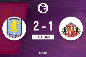 上半场补时2分钟,阿斯顿维拉2-1桑德兰。