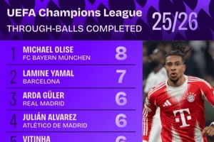 体育资讯4月16日讯 Squawka列出了本赛季欧冠成功直塞传球排名,奥利塞8次居首,亚马尔7次第二。
